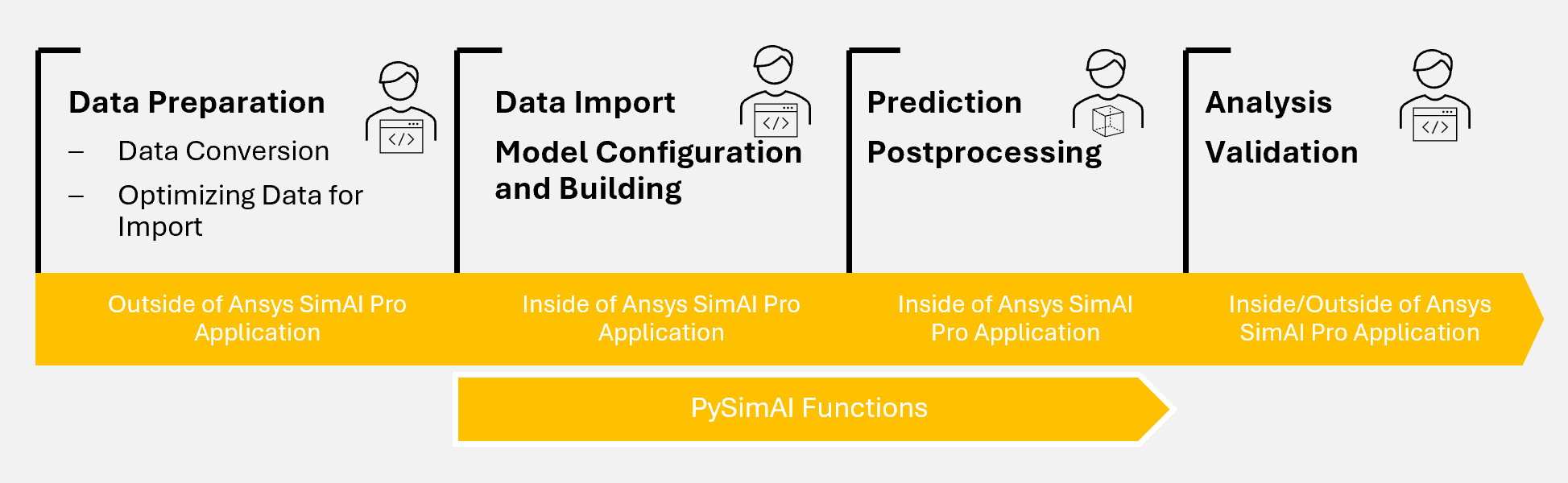 The following illustration depicts the Ansys SimAI Pro application user workflow. The main actions described in the picture are explained in more details in the paragraphs below with links to the relevant parts of the documentation.
